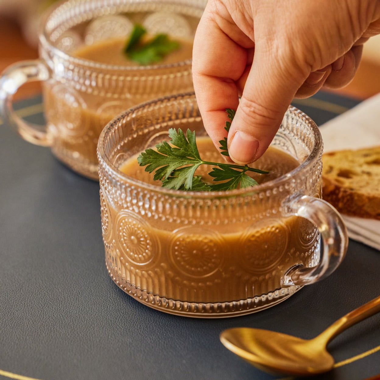 Tazón de vidrio vintage, ideal para el café con leche de la mañana, chocolate caliente e incluso para consomé, por su gran tamaño de casi medio litro le da un toque de elegancia a tu mesa.